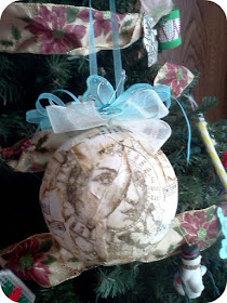 All you need is some very ugly glittered plastic ball from your local dollar store, sheet music, some stamps (optional), and brown ink pad, mod podge, and some pretty ribbons or embellishments!