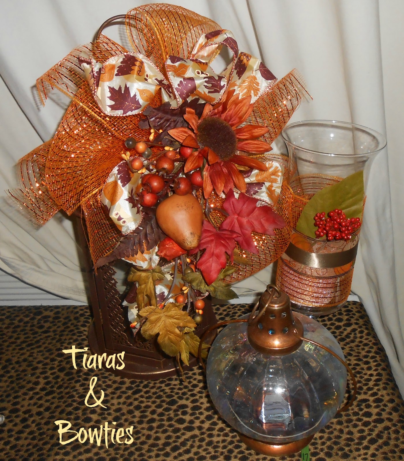 A collection of lanterns in different sizes and textures along with inexpensive candle holders can be grouped to create the warm textural ambiance the Autumn season is all about. Here, I've grouped 3 on a bookshelf that sits in our living room. The warm copper tones of the lanterns mixed with bright autumnal colored ribbons and floral sprays give the sense of sight a little show. The cheetah print runner in it's warm and welcoming tones give the display a bit of playfulness.